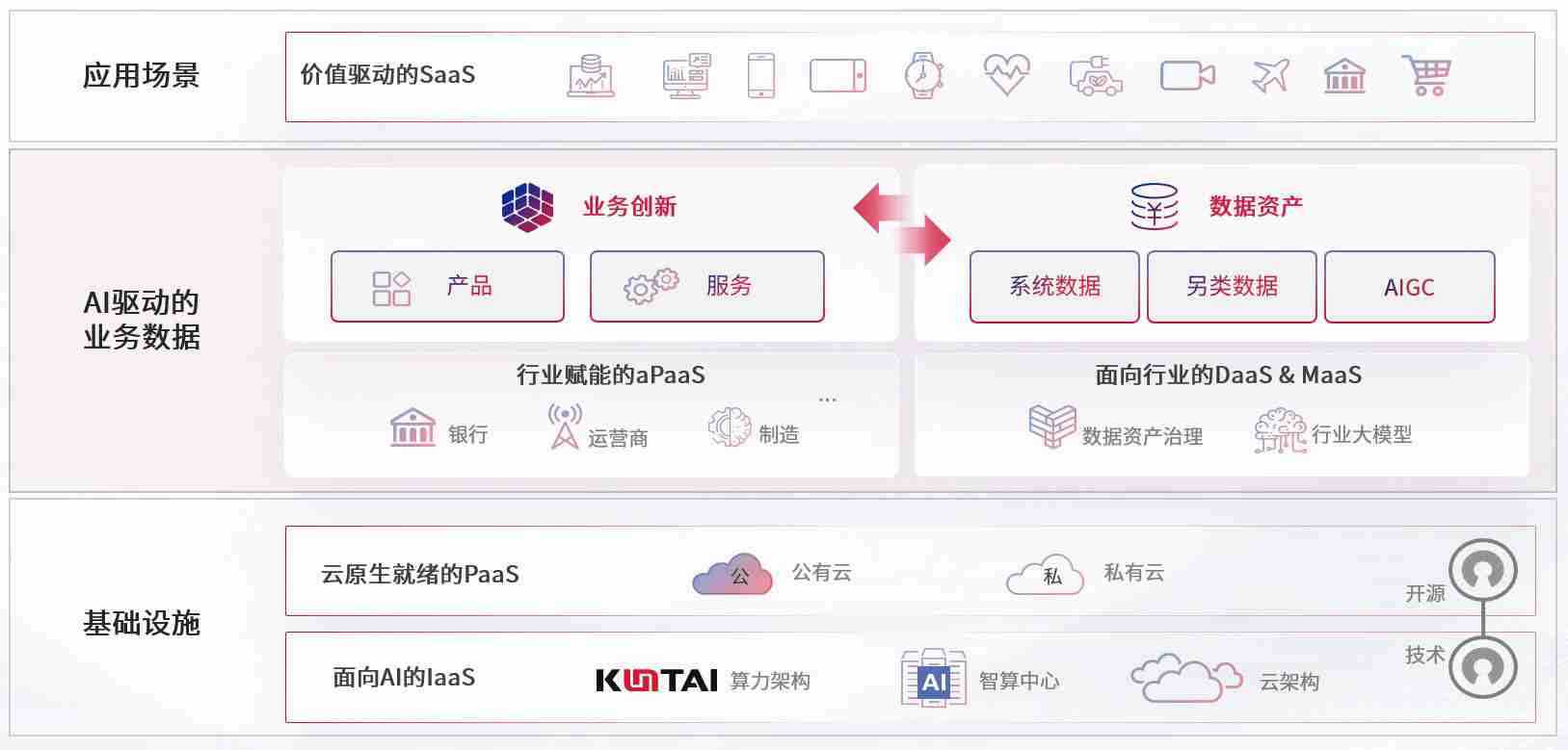 数字时代,,围绕企业数字化转型的关键要素,,,,尊龙z6数码开创性的提出数云融合战略和技术体系框架,,着力在云原生、、、数字原生、、、、AI原生和信创产业上架构产品和服务能力,,,为处在不同数字化转型阶段的快消零售、、、汽车、、、金融、、医疗、、政企、、教育、、运营商等行业客户提供泛在的敏捷IT能力和融合的数据驱动能力,,构建跨界融合创新的数字业务场景和新业务模式,,,,助力企业级客户建立面向未来的核心能力和竞争优势,,,,全面推动社会的数字化、、、智能化转型升级。。
