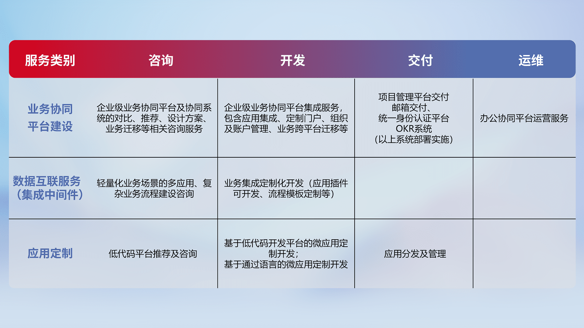 针对钉钉、、、企微、、IDaas等平台级产品提供产品的规划、、、、方案、、、交付、、定制化开发等服务,,,实现如统一协同办公、、智能客户服务、、、混合会议管理、、智能数据查询、、等业务场景,,实现数字化转型。。