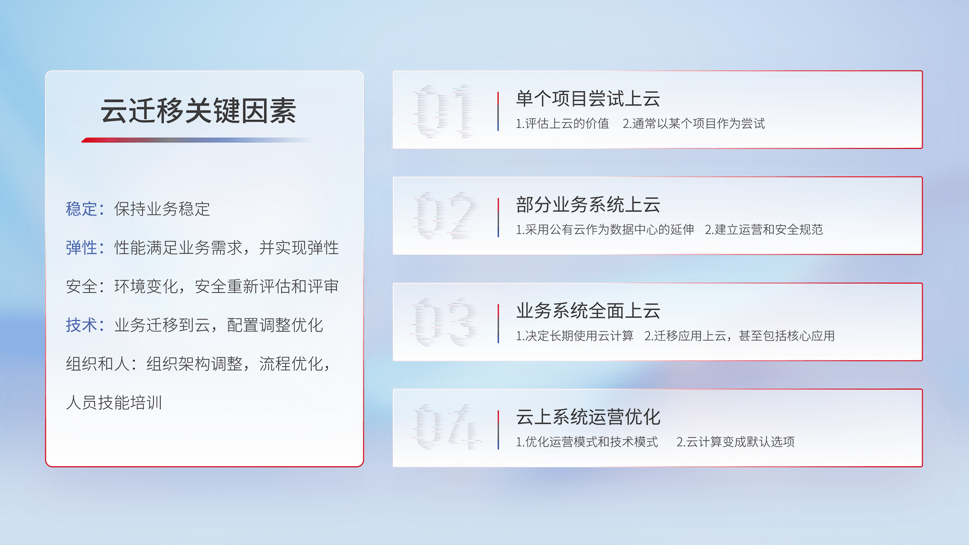 结合实际业务,,从规划设计、、、云平台选型、、、云原生改造、、数据迁移、、集成交付,,迁移全过程为客户识别最佳上云路径,,做好风险识别管理,,,,设计网络架构、、、、身份权限、、、安全审计合规、、、操作审计、、日志审计、、、监控告警策略、、、多站点容灾设计等,,对云上基础设施进行整体规划,,,,提升IT治理水平,,以满足弹性、、、高可用、、、高性能的需求。。