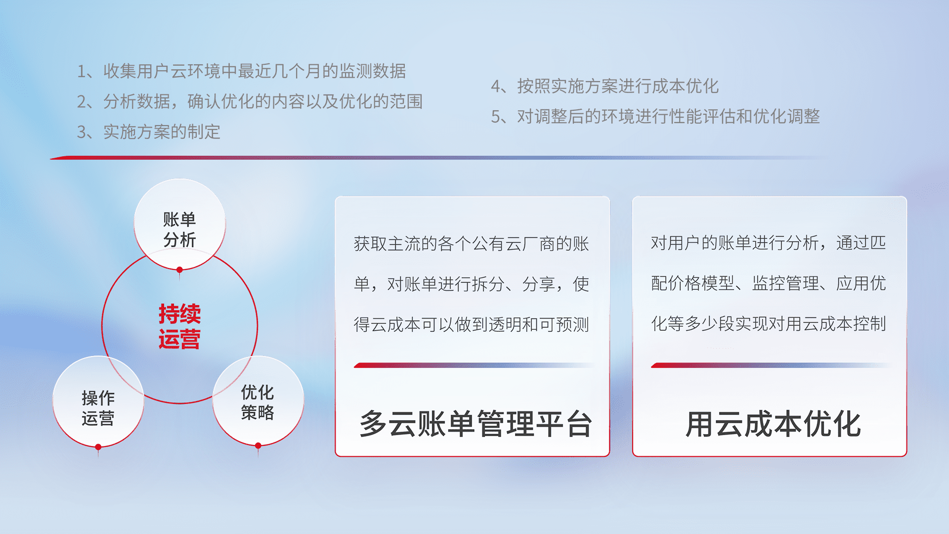 通过多云纳管,,,以统一的资源数据模型把客户的云资源进行抽象和封装,,进而实现对多云资源的统一操作,,保障云资源管理的可靠性、、稳定性与可用性。。量身定制化运维内容,,,配置、、、、开发运维、、、补丁管理、、备份、、、、监控、、、、认证和访问管理、、、、审计和日常巡检等,,,保障在用云过程中的可靠度,,稳定度以及高可用率。。